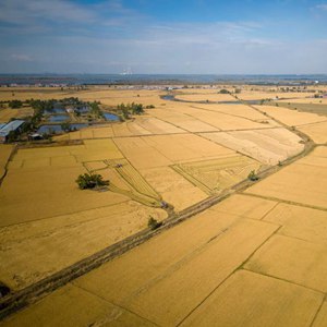 这是10月5日拍摄的黑龙江省哈尔滨市道外区民主镇金黄色的稻田(无人机照片)。新华社记者 张涛 摄