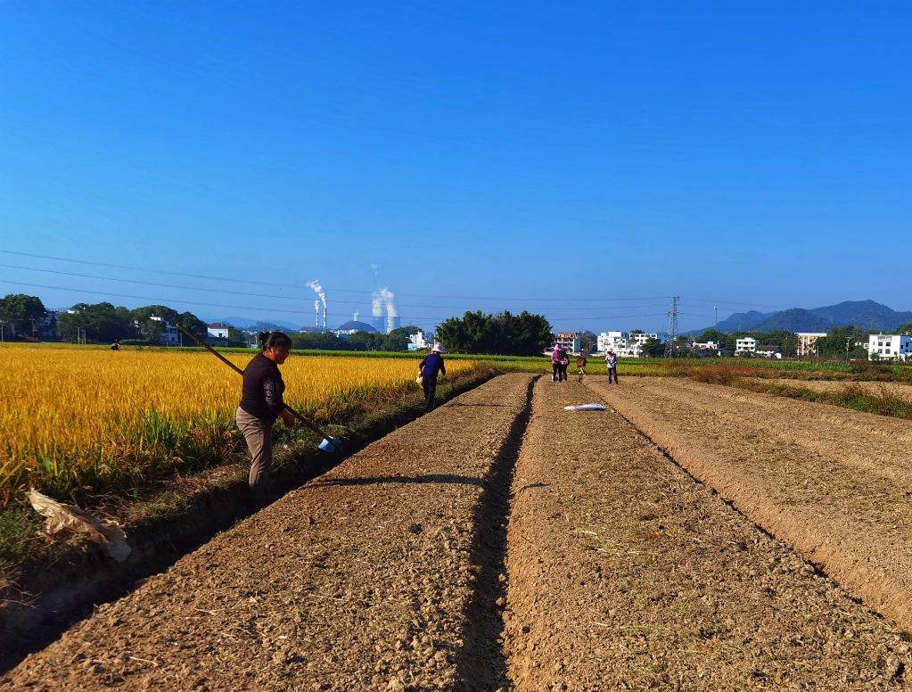 江西省赣州市赣县区江口镇,农户们趁着好天气翻地种油菜。(受访者供图)
