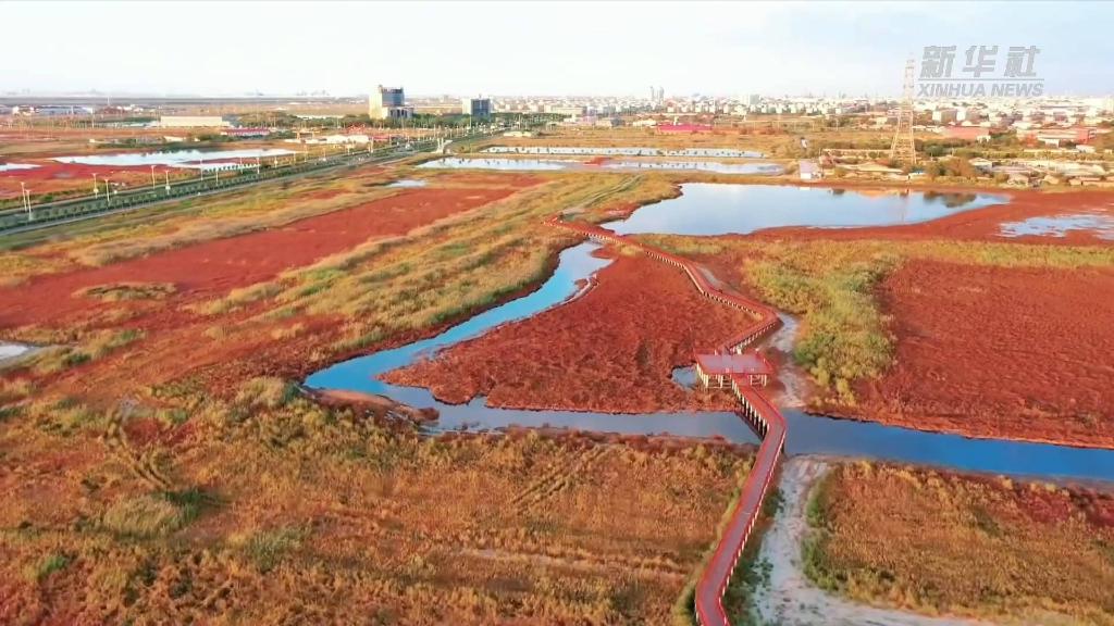 近日,在天津市滨海新区的大港油田附近,出现了一片“红海滩”。
