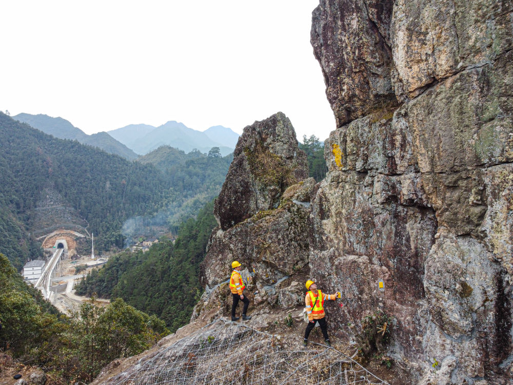 2021年1月20日,衢宁铁路巡守工张凯强(左)、钮意强攀登到衢宁铁路银岭隧道山顶观测危石情况。