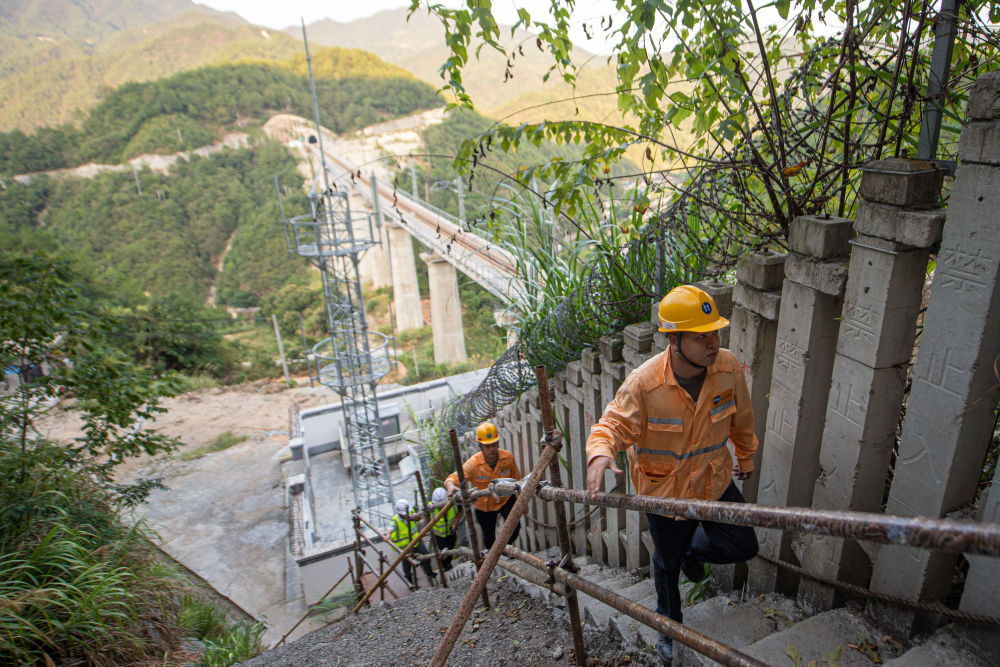 9月19日,看守员赵伟灯(右)与蔡金矿在前往赤岭隧道防洪值守点的山路上行走。