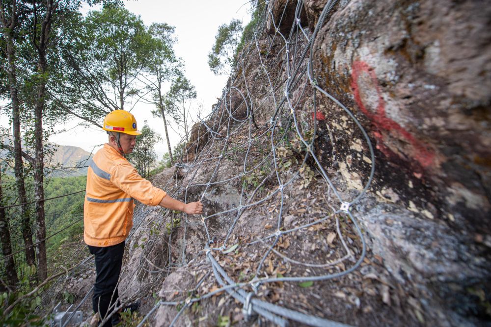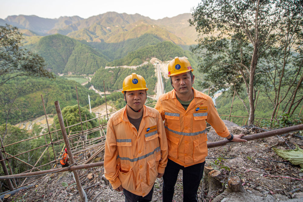 辛勤工作一周的另外两名看守员已经在防洪点简易小屋的门口翘首以盼了。赵伟灯与蔡金矿抵达的第一件事就是与他们完成工作的交接,随后戴上安全帽,带上工具包,沿着脚手架搭成的便梯,继续向赤岭隧道山顶存在地质灾害隐患的点位攀登。为了确保能够拍到最理想的画面,我第一个攀上便梯,迅速爬到一处可供停留驻足的平台,连续按下快门。抵达山顶之后,我继续与赵伟灯一起,手脚并用地攀过一处悬崖边的隘道,记录下他检查地质灾害隐患点位的影像。山顶的地势狭窄却毫无遮拦,脚下就是延绵的山丘和那条贯穿其中的钢铁巨龙,我邀请赵伟灯与蔡金矿在他们工作、坚守、奋斗的山顶合影留念。