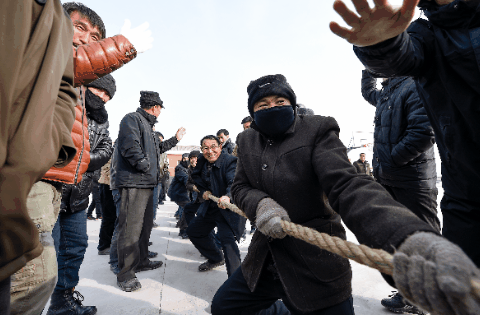 ↑冬泳爱好者刚入水时往身上泼水以适应温度