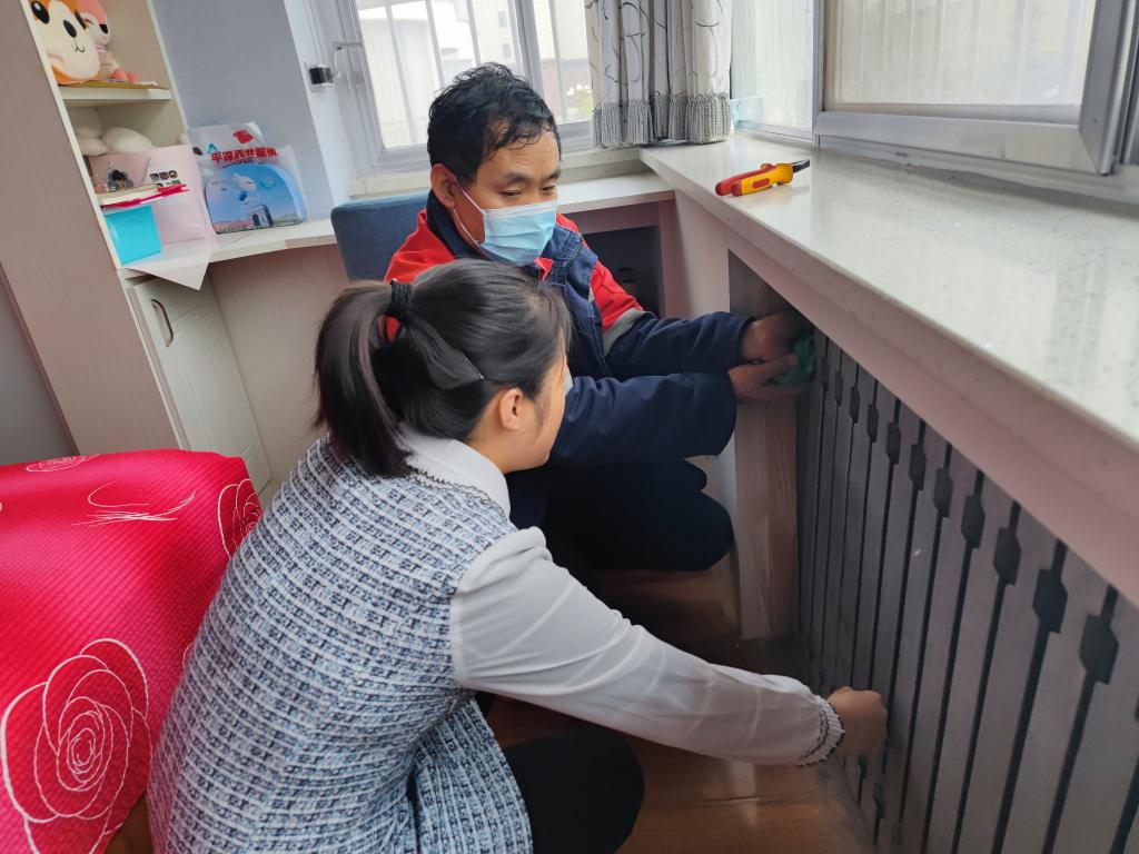 甘肃省平凉市一家供热公司工作人员正在老旧小区居民家中检修。(受访单位供图)