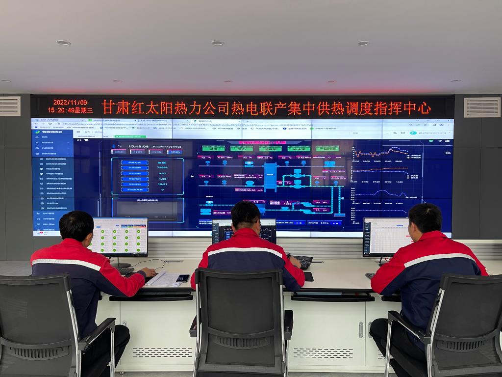 在甘肃省平凉市,热电联产集中供热调度指挥中心的员工们正在工作。(受访单位供图)