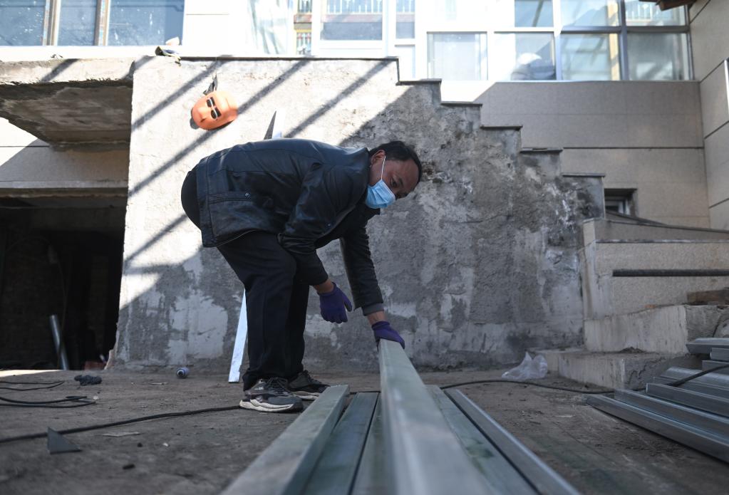 11月16日,在西宁市大通回族土族自治县青山乡贺家庄村,村民贺俊成正在搬运钢梁。(新华社记者张龙 摄)