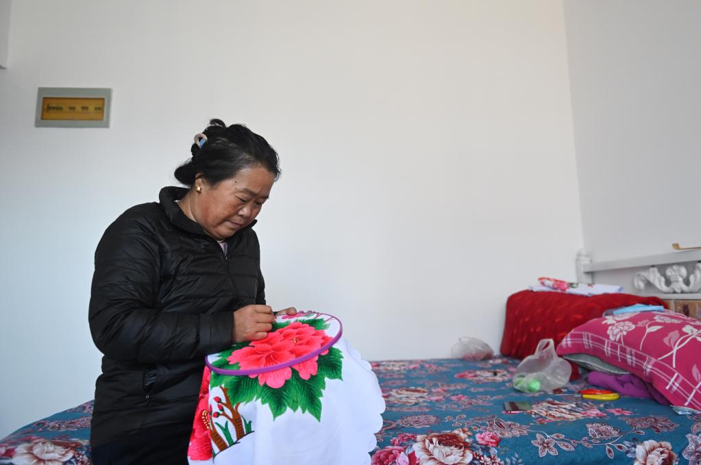 11月16日,在西宁市大通回族土族自治县东部新城的临时过渡房内,村民兰卓麻正在绣花。(新华社记者张龙 摄)