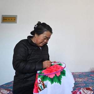 在大通县东部新城的临时过渡房内,土族居民兰卓麻哼唱着民歌,手中的针线翻飞不停,不一会儿,一朵艳丽的花儿刺绣完成。“冬天农忙结束闲下来,就想着绣上一床铺盖。”
