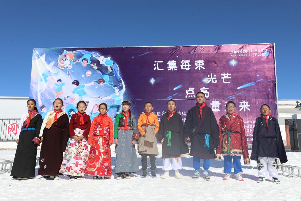 孩子们身后的雪山积雪皑皑,一排排光伏板在阳光下熠熠生辉。在“汇集每束光芒,点亮儿童未来”的主题背景板前,学生们兴致勃勃签名涂鸦。