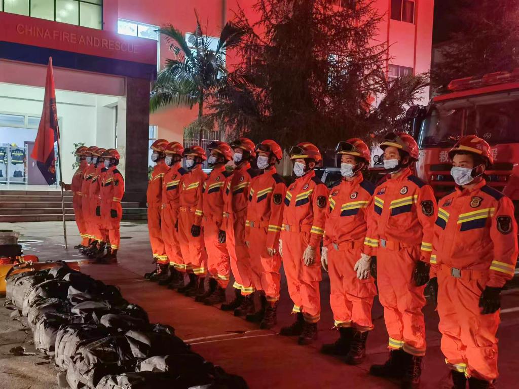 11月19日凌晨,云南省红河州消防救援部门组织人员前往震中地区。(云南省消防救援总队供图)