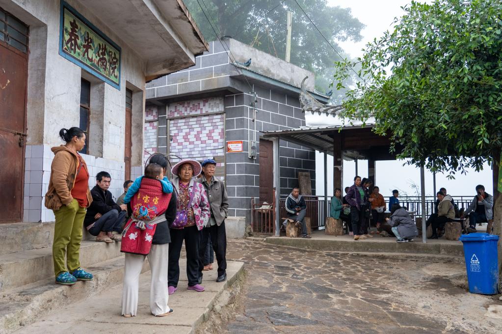 11月19日,在红河县浪堤镇安品村,村民们在凉亭休息。(新华社记者 曹梦瑶 摄)