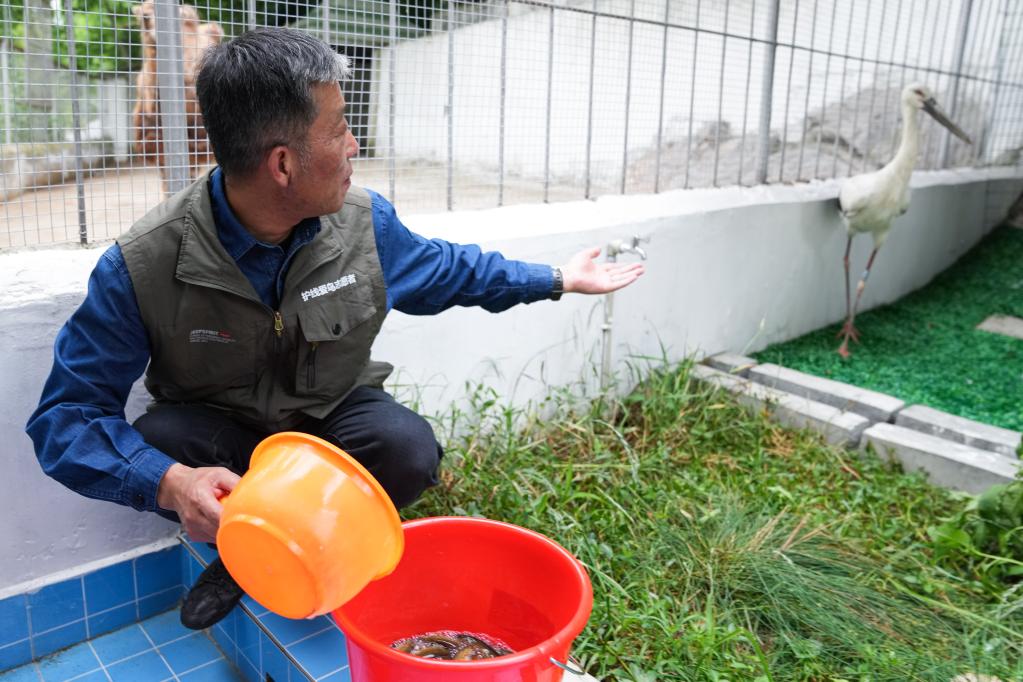 在池州市野生动物收容救助站,汪湜投喂他救助的受伤的东方白鹳。新华社记者杜宇 摄