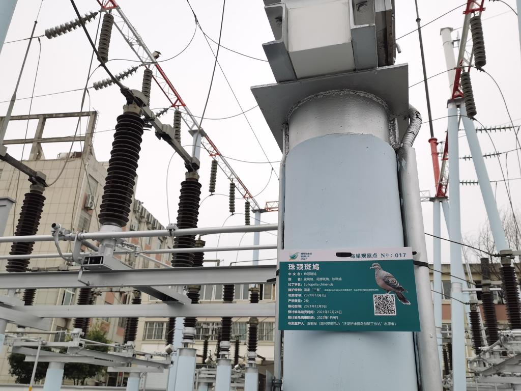 在池州供电公司110千伏齐山变电站,各类密布的电力设备中,有几块标识牌格外显眼。“这是我们设置的‘鸟巢观察点’,上面有在此筑巢的鸟的各类信息,包括保护级别、筑巢时间、产卵数量、孵化时间、预计雏鸟离巢时间等。”汪湜介绍,像这样的标识牌,今年以来在池州设立了270多个。
