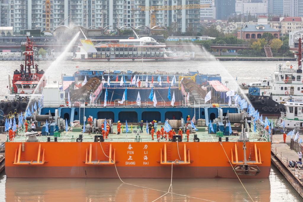 25日13时30分,“奋力”轮顺利“入坞”,弧形梁考古沉箱精准安放于“马鞍座”上,宣告长江口二号古船整体打捞迁移完成,接下来将启动考古发掘、文物整体保护和博物馆规划建设工程。