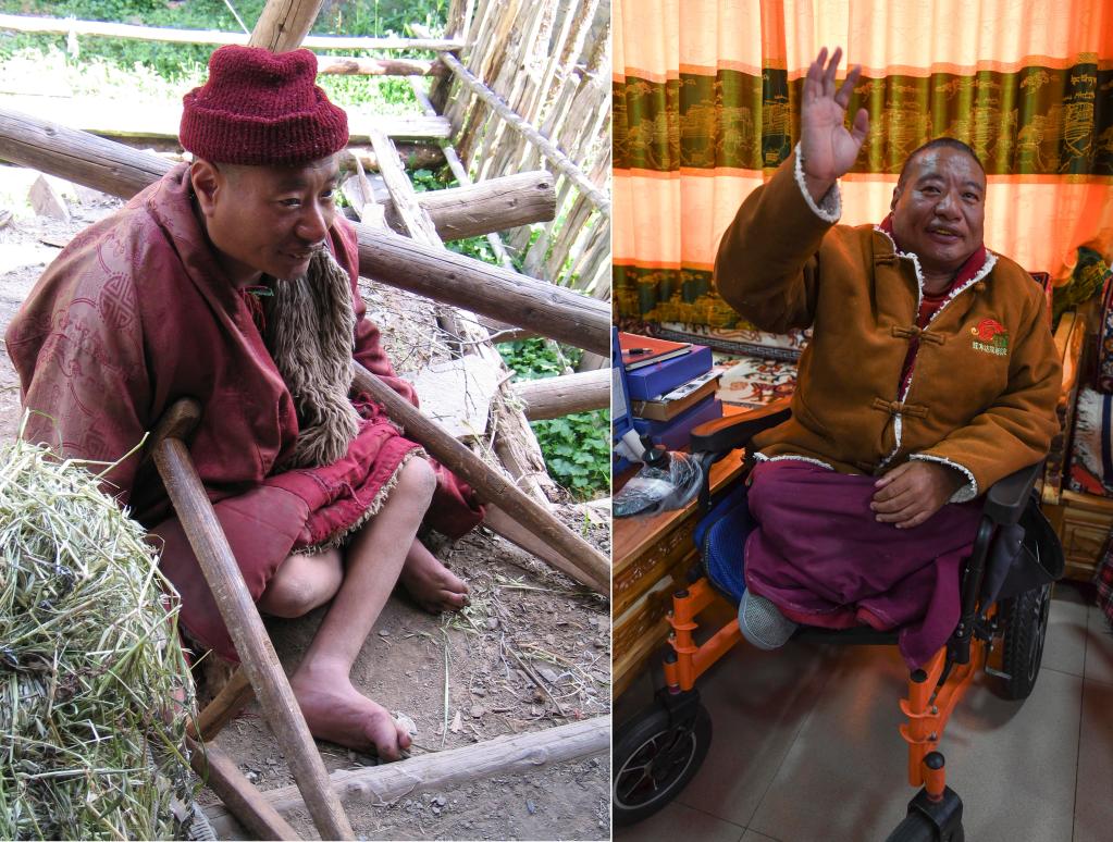 拼版照片:左图是2004年8月3日在四川省阿坝藏族羌族自治州壤塘县拍摄的当时身患严重大骨节病的土扎。新华社发(田刚摄);右图是在茸木达乡敬老院,土扎坐在电动轮椅上(2022年10月16日摄)。新华社记者王曦 摄