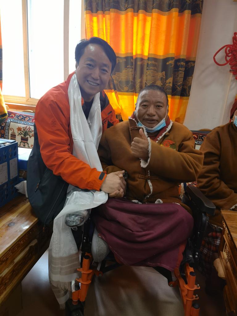 即使是冬天,阳光好的时候,53岁的藏族群众土扎也照常会操作着电动轮椅到敬老院的院坝里晒太阳。由于他的双腿早年因病萎缩无法行走,来到敬老院后,轮椅成了他的另一双腿,可以让他自由地从房间到院坝、食堂等地。