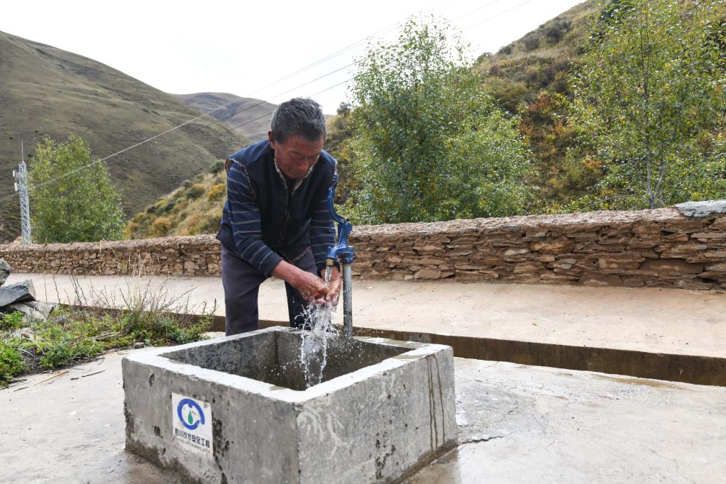 在四川省阿坝藏族羌族自治州壤塘县茸木达乡巴尔依村,钟伟打开院子里的自来水龙头洗手(2022年10月16日摄)。新华社记者王曦 摄