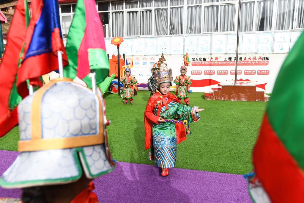 在四川省阿坝藏族羌族自治州壤塘县茸木达乡巴尔依村幼儿园,学生们正在表演藏戏(2022年10月16日摄)。新华社记者王曦 摄