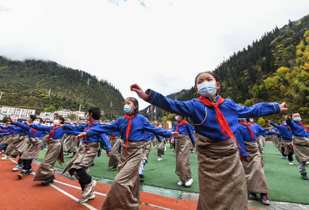 在四川省阿坝藏族羌族自治州壤塘县寄宿制小学,学生在操场上做课间操(2022年10月15日摄)。新华社记者王曦 摄
