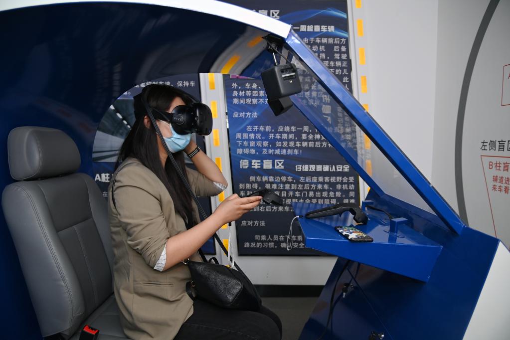 2022年5月19日,一位参观者在虚拟现实技术设备上体验学习安全驾驶知识。新华社记者 李一博 摄