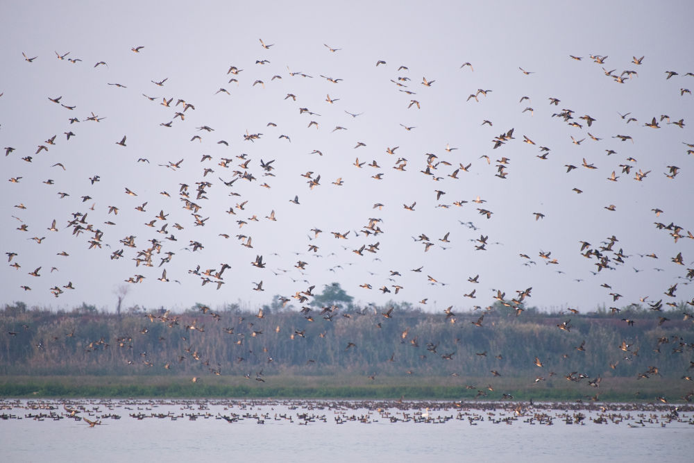 ↑ 11月10日,成群的罗纹鸭在湖南西洞庭湖国家级自然保护区低飞。新华社记者陈思汗摄