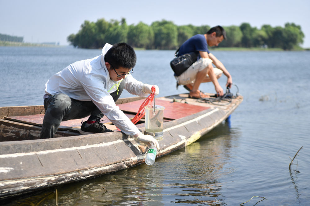 ↑ 2018年8月25日,观测研究站的科研人员耿明明(左)在洞庭湖的一处观测点对湖水进行取样,准备带回实验室进行进一步检测。