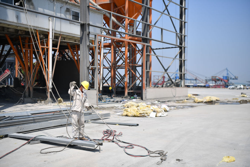 ↑ 2018年7月11日,在湖南省岳阳市洞庭湖畔的天欣码头,工人在拆除混凝土搅拌站。过去,这里是一个砂石中转码头和散货集散地。