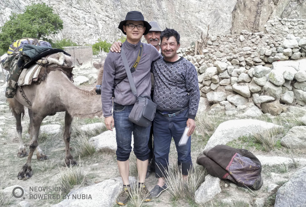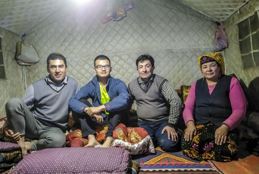 ↑ 2018年11月17日,在搬迁前夜,我(左二)和负责向导和采访翻译工作的时任大同乡扶贫干部克那艾提(左一)与都热·加尔曼夫妇在深山旧居的帐篷内合影。