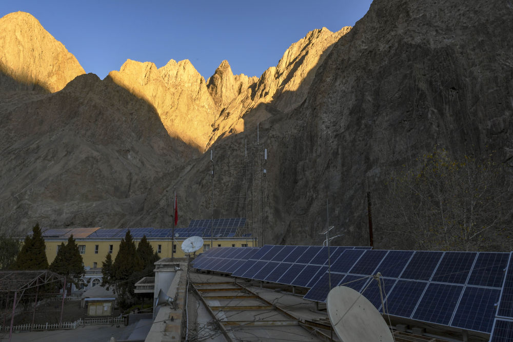 ↑ 上午10点09分,太阳仍只能照亮山顶,塔县大同乡政府楼顶的光伏电板还未被照射到(2018年11月11日摄)。冬季,光伏电板被照射时间有时一天不足3小时。