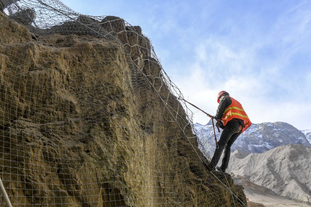 ↑ 在塔县大同乡通往县城公路施工现场,工人在峭壁上安装防护网(2018年11月12日摄)。