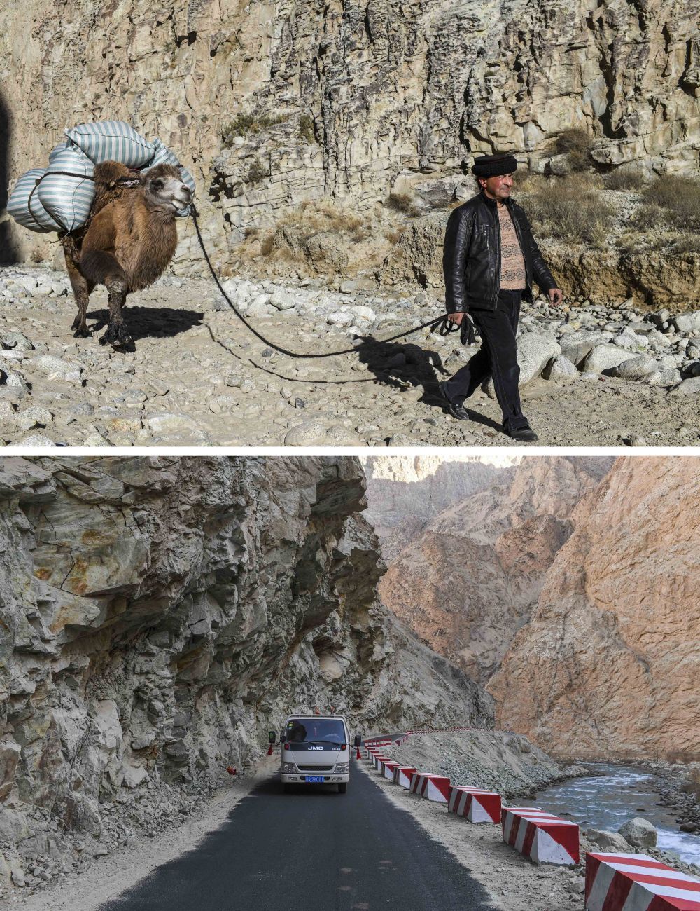 ↑ 牧民都热·加尔曼通过骆驼、汽车,辗转完成从山中小村到县城旁安置点的搬迁之路(2018年11月17日摄)。