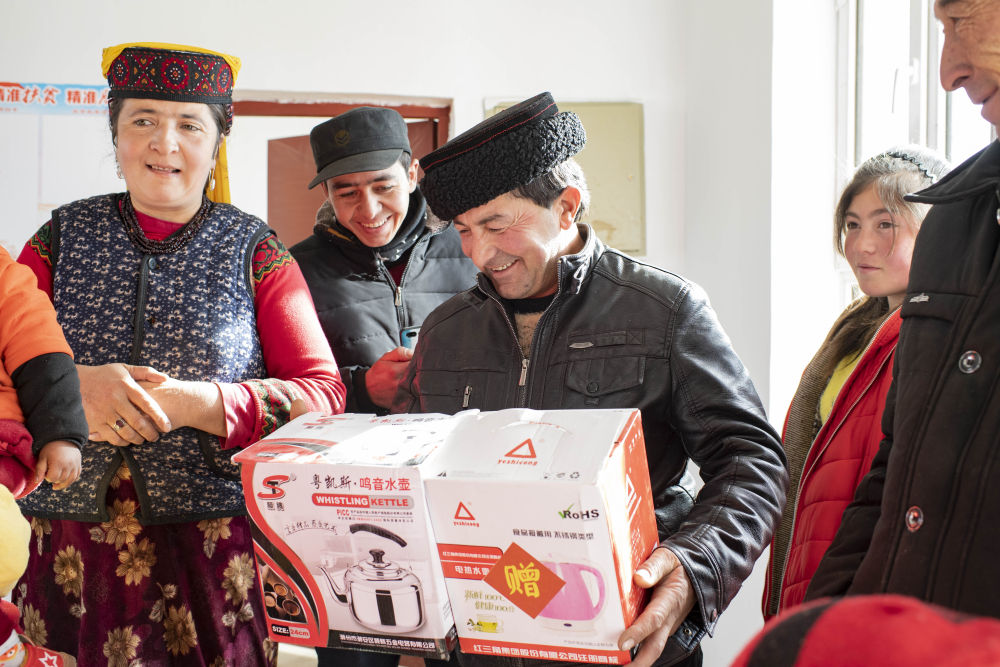 ↑ 都热·加尔曼(中)搬迁到新家时手捧由“万企帮千村”项目提供的小家电,邻居纷纷前来迎接祝贺(2018年11月18日摄)。