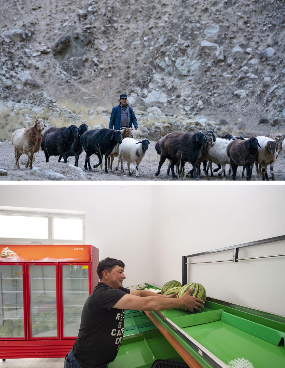 ↑ 拼版照片上图:搬迁前,都热·加尔曼在山谷里放牧(2018年11月16日摄);下图:搬迁后第二年,在新居旁的综合市场,都热·加尔曼在新开办的商店内摆放准备售卖的西瓜(2020年6月24日摄)。