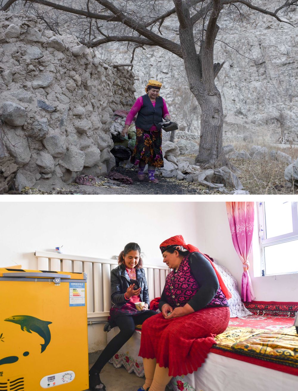 ↑ 拼版照片上图:搬迁前,都热的妻子在深山旧居内拿煤炭准备取暖(2018年11月16日摄);下图:都热的妻子和女儿在新居内聊天休息(2020年6月3日摄)。