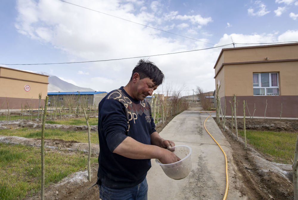 ↑ 都热·加尔曼在新家小院内播撒草籽(2020年6月3日摄)。搬迁至新居后,都热已将小院装点得有模有样。