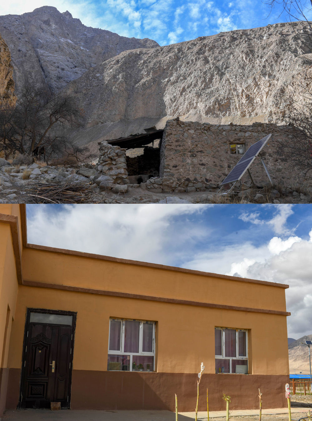 ↑ 拼版照片上图:塔县大同乡阿克托尕栏杆村深山里代表性老房子(2018年11月13日摄);下图:在塔县易地扶贫搬迁安置点拍摄的新房(2019年6月26日摄)。