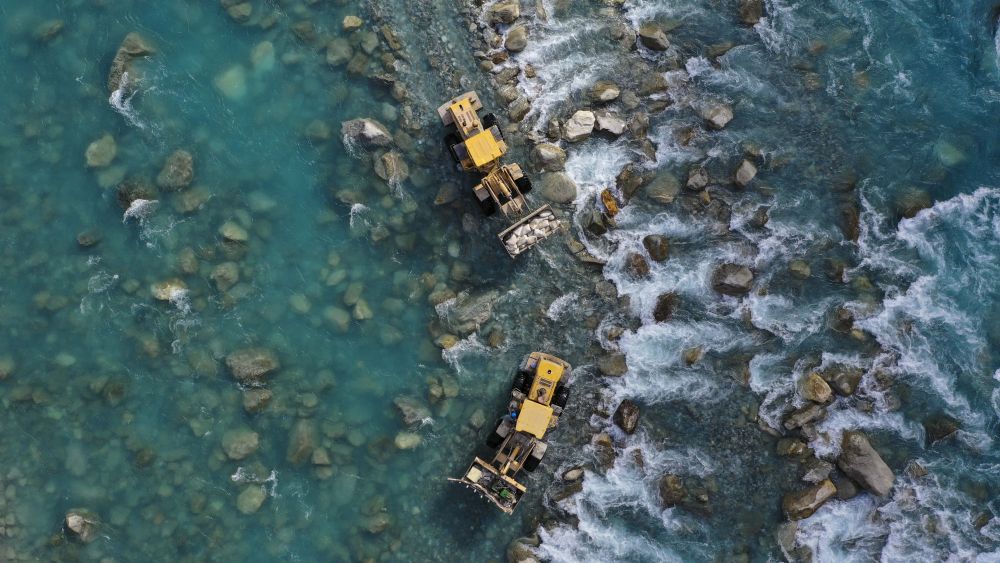 ↑ 在塔县大同乡库如克栏杆村,电力工人利用施工车辆运送水泥、铁塔零件过河,为铺设线路做准备(2019年11月24日拍摄)。