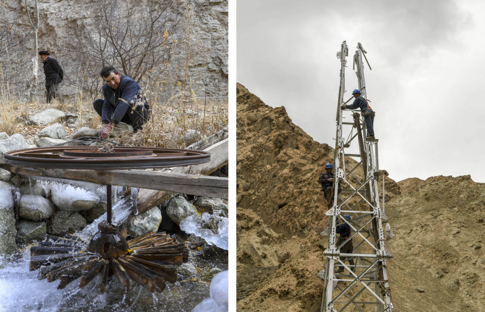 ↑ 拼版照片左图:大同乡阿克托尕栏杆村村民西热力汗·努尔丁在修理自家门前的小型水力发电机(2018年11月13日摄);右图:工人在大同乡架设电力铁塔,当年该乡历史上第一次接通大网电(2020年6月12日摄)。