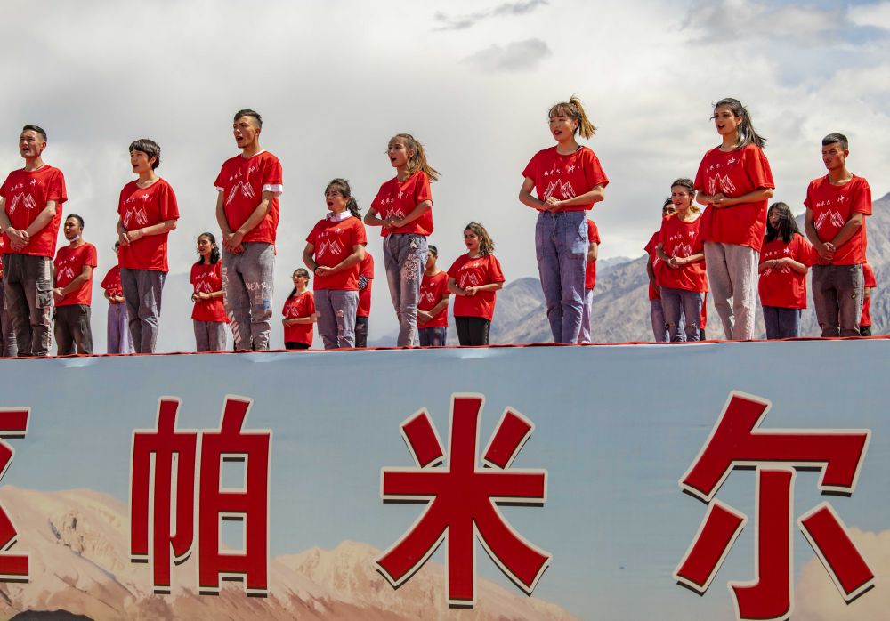 ↑ 塔县青年玛合尔基克·吾拉木(前排右三)和同伴们在文化活动上演唱歌曲《我和我的祖国》(2020年6月25日摄)。