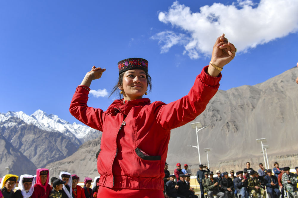↑ 塔县达布达尔乡热斯喀木村村民在演出现场随着音乐欢快起舞(2020年6月6日摄)。