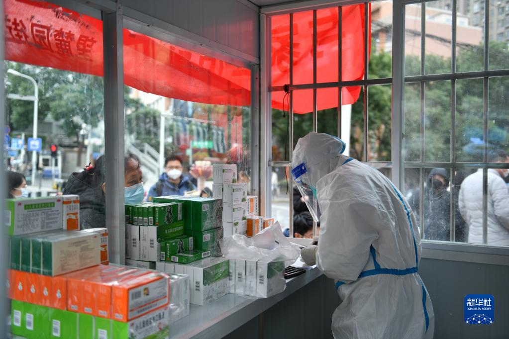 12月20日,患者在湖南省长沙市开福区望麓园街道社区卫生服务中心发热诊疗站取药。 新华社记者 陈振海 摄
