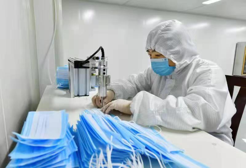 图为安阳市级残疾人辅助性就业机构——安钢附企福利公司的残疾人职工在加班加点生产口罩。