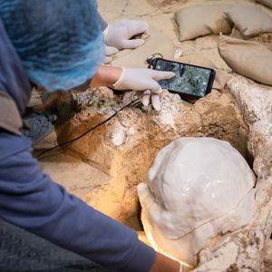 在头骨化石提取现场,记者在1000多平方米温湿可控、功能完备的考古方舱内看到,“郧县人”3号头骨周围布满了动物化石,考古队员使用电动的风刻笔,宛如牙医一般一点点地把头骨化石周围的胶结物剔除。半年多以来,考古队不断地将人类化石、动物化石和石制品从堆积物和胶结致密的钙质结核体中剥离,使百万年尘封土裹的远古人类遗珍逐渐显露。