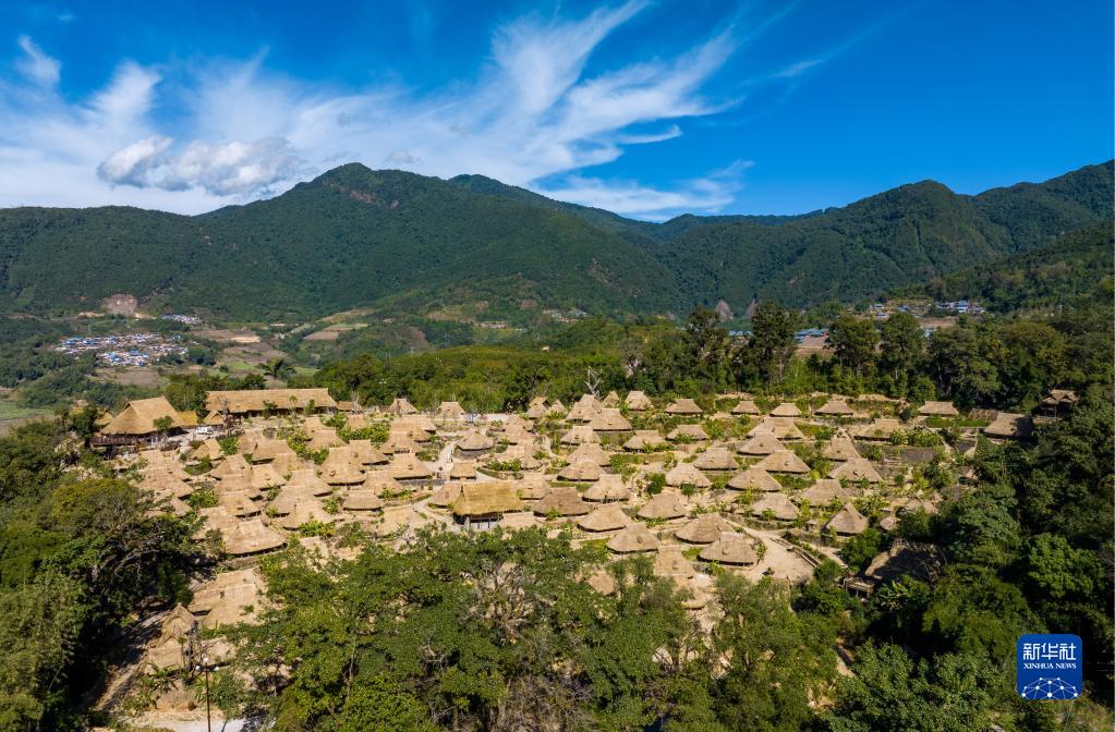 从空中俯瞰重建中的翁丁老寨(无人机照片,12月8日摄)。新华社记者 江文耀 摄