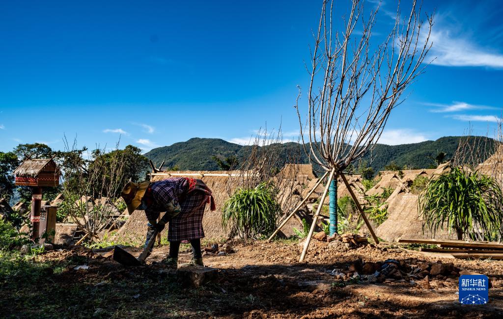 工人在翁丁老寨进行绿化重建工作(12月8日摄)。新华社记者 江文耀 摄
