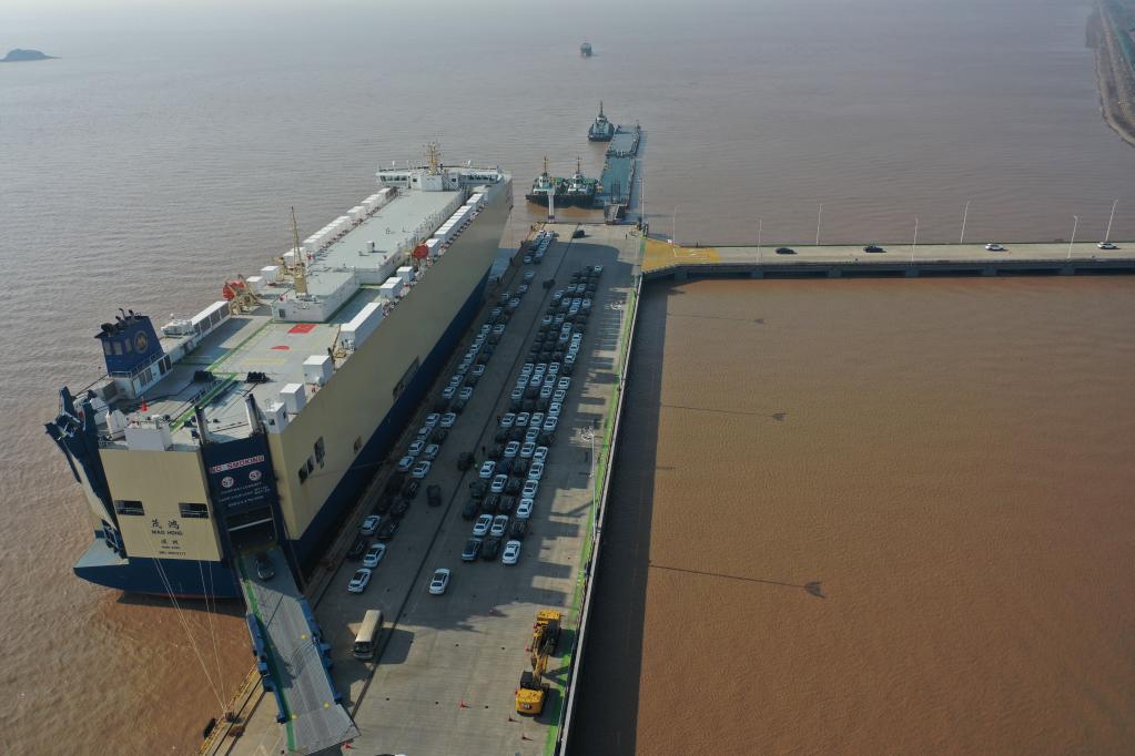 一艘滚装船停靠在浙江宁波舟山港梅西滚装码头,装运的汽车从船内驶出。新华社记者黄宗治 摄
