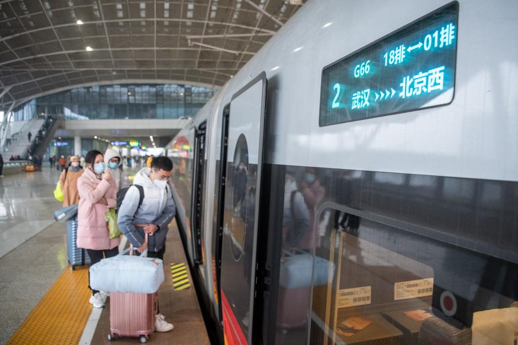 1月7日,在武汉站站台,乘客登上G66次列车。新华社记者 伍志尊 摄