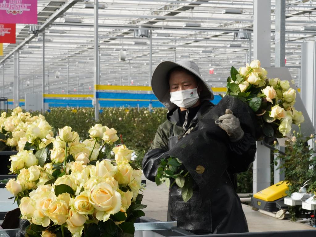 在百益亿农国际鲜花港玫瑰工厂内,工人正在采摘玫瑰。(新华社记者周梦蝶 摄)