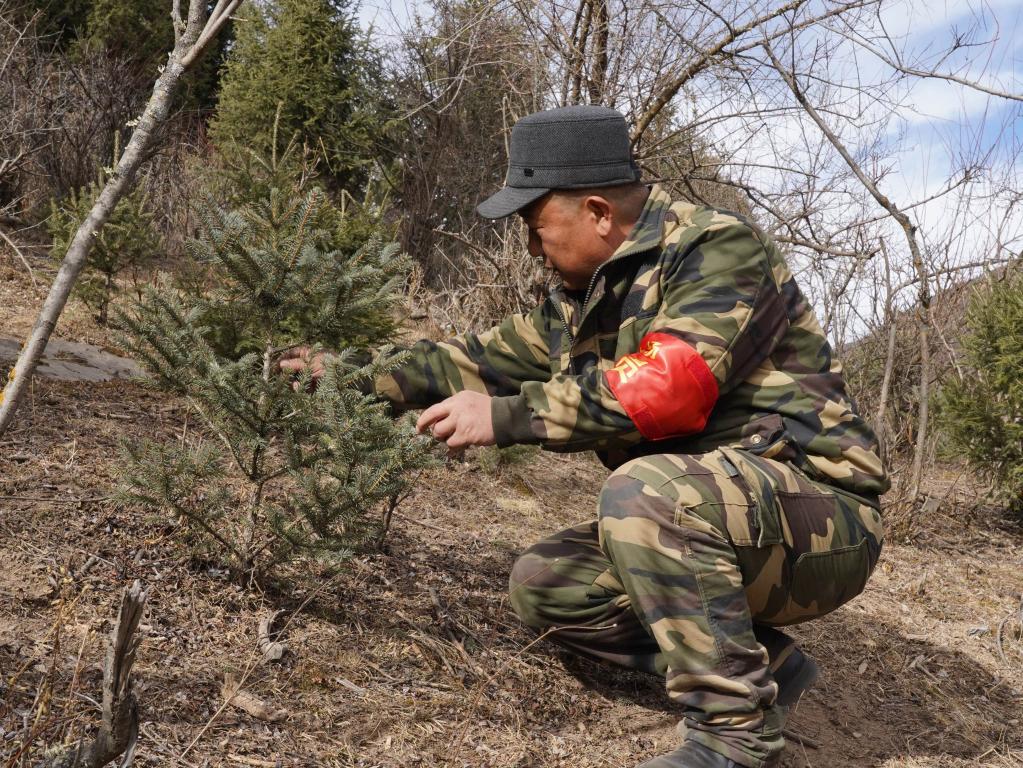 护林员杨安生正在林场查看云杉的生长情况。(新华社记者 周梦蝶 摄)