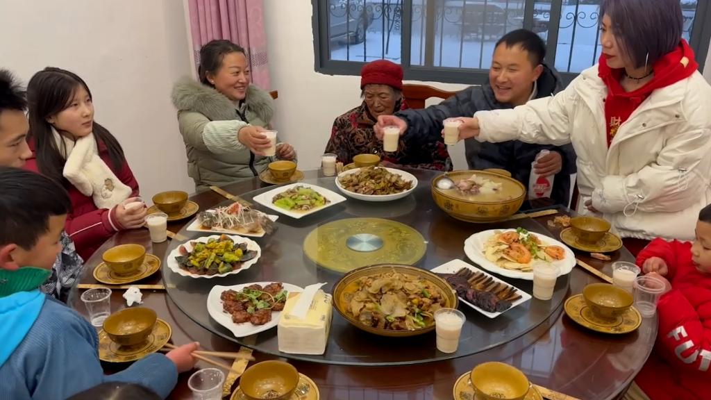 在新年前夕,唐代军特意将家人们接回来农庄,在窗外的鹅毛大雪下共同举杯庆祝,期许在新的一年万事顺遂。
